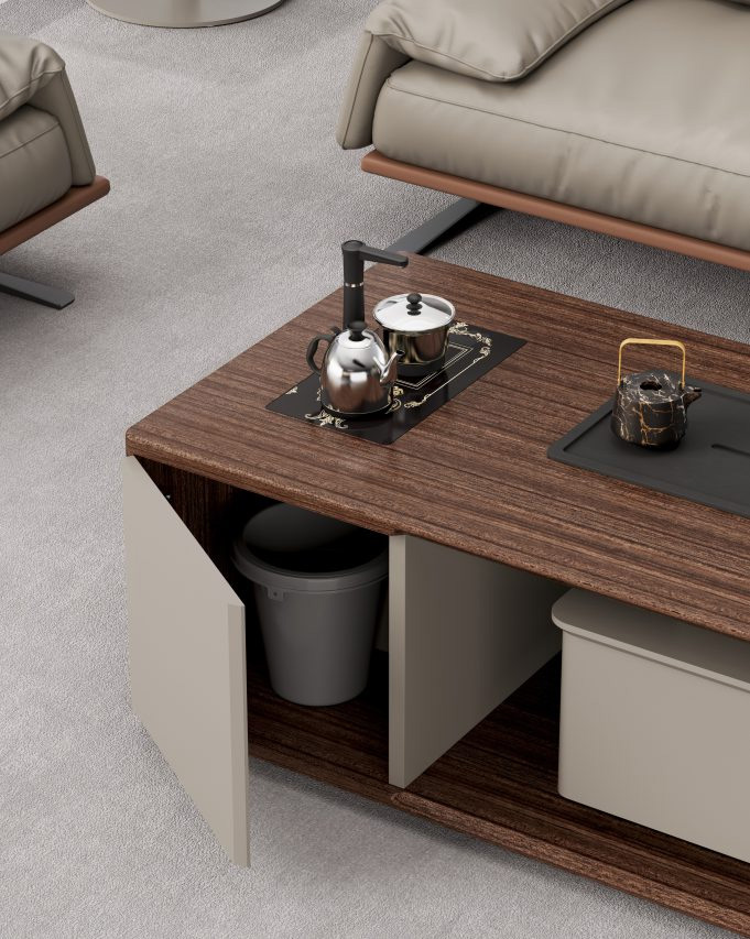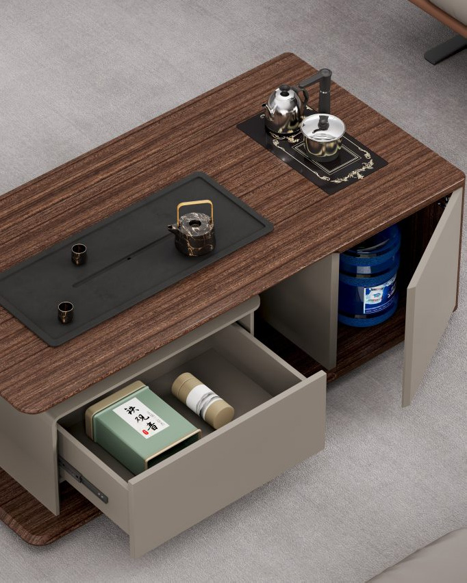 五金配件:博格維斯品牌緩沖導軌、NOVEI緩沖門鉸;臺面配黑拉絲走線盒。