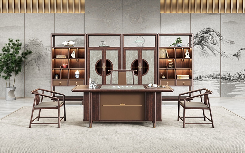 鴻泰系列在造型上主要采用硬朗簡潔的直線條,溫潤的烏金木與質(zhì)樸的巖板相結(jié)合,剛?cè)岵?jì),時(shí)尚大方,既使得中式家具古典、質(zhì)樸的內(nèi)涵顯現(xiàn),又符合現(xiàn)代辦公追求的時(shí)尚感、實(shí)用性。