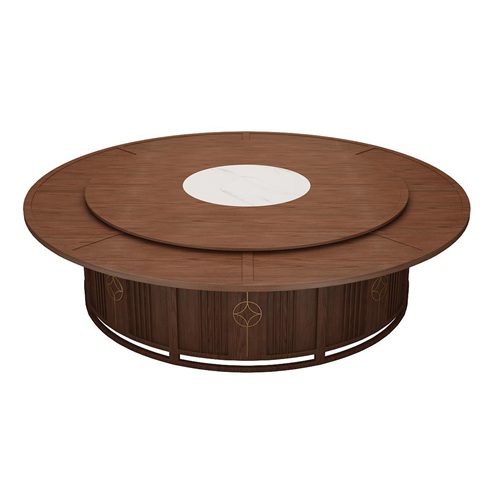 。這款宴會餐廳新中式實木20人轉(zhuǎn)盤電動餐桌是由經(jīng)典的胡桃色實木與白色大理石搭配。轉(zhuǎn)盤是白色的大理石,桌面是胡桃色的實木,這樣看起來電動餐桌上下更加呼應(yīng),底座采用很前衛(wèi)的豎行格柵,并且在桌面可以電動遙控旋轉(zhuǎn),讓電動餐桌功能更加豐富,就餐者有更好的就餐體驗。