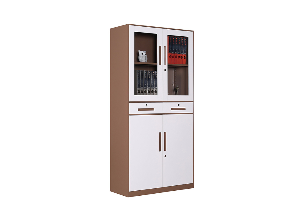 ● 一體結(jié)構(gòu)設置,上部玻璃對開門,內(nèi)置1層層板可調(diào)高度,內(nèi)置物品可視,便于拿取,中間2個抽屜,下部對開鐵門、門內(nèi)一格板,設置有拉手和鎖。