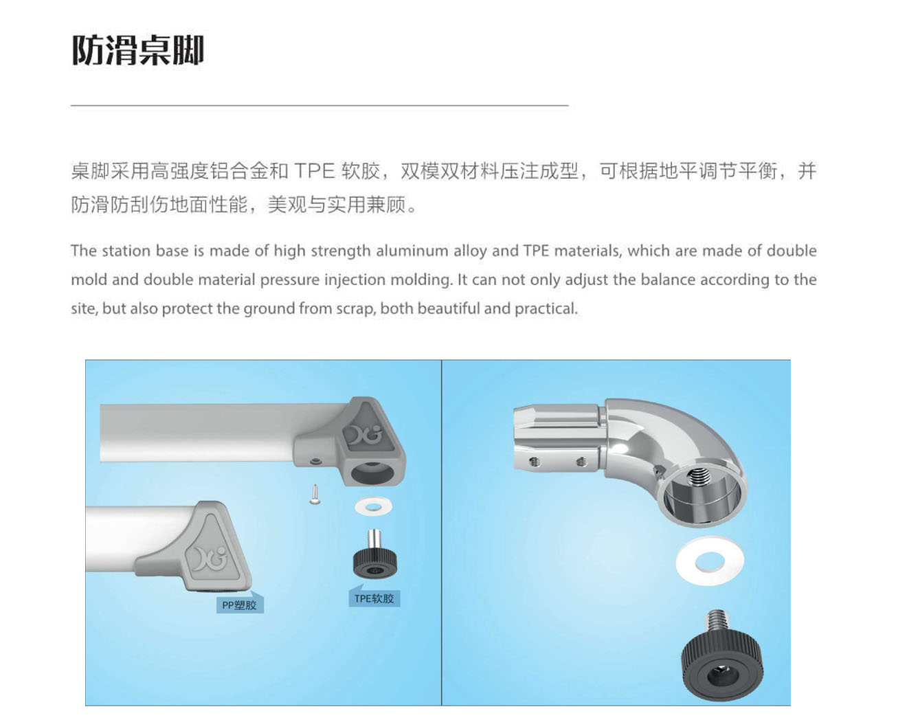 4.桌腳掌:1.8mm壁厚,腳套底有4個平衡腳套。
