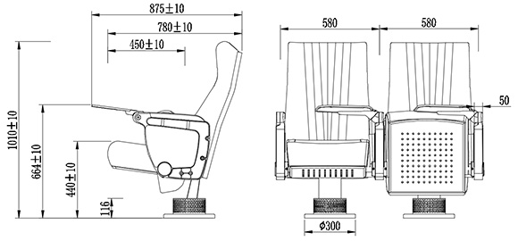 | 主要規(guī)格 | 座寬(扶手中對(duì)中):580mm,座椅總高:1000±10mm,座高:445±10mm。 |