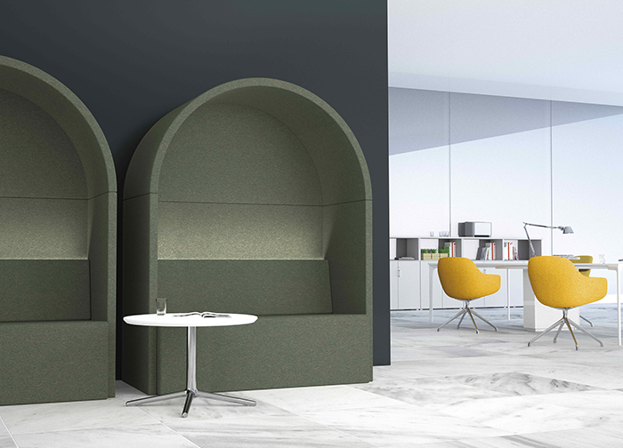 ROMA沙發(fā)的造型靈感來(lái)自于羅馬建筑元素—拱門與羅馬柱,設(shè)計(jì)師將這 兩個(gè)元素融入到現(xiàn)代辦公行為學(xué)當(dāng)中,為用戶營(yíng)造出一個(gè)具備私密性與實(shí) 用功能相結(jié)合的休閑座具,同時(shí)構(gòu)建出一個(gè)挺立于辦公休閑區(qū)的小建筑。