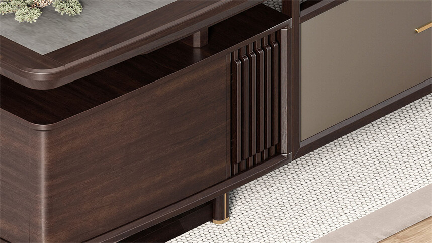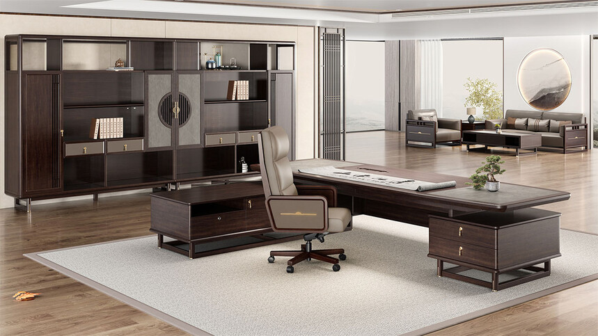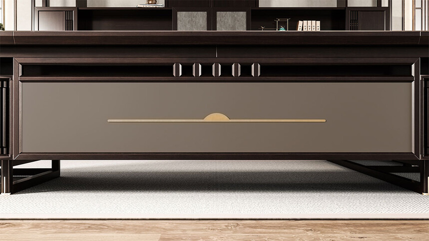 鴻泰系列是一款新中式風格的辦公家具,設計靈感源于中式傳統(tǒng)裝飾紋樣“回”字形,因其形式回環(huán)反復,延綿不斷,在民間有“富貴不斷頭”的說法,有連綿不斷、吉利長久的吉祥寓意,在造型上主要采用硬朗簡潔的直線條,溫潤的烏金木與質樸的巖板相結合,剛柔并濟,時尚大方,既使得中式家具古典、質樸的內涵顯現,又符合現代辦公追求的時尚感、實用性。